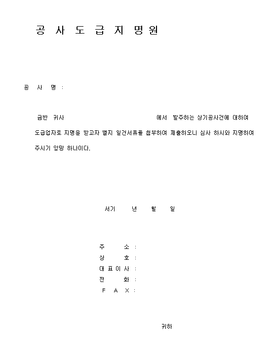 실무에서 인정받는 공사 도급 지명원 양식은 다음과 같은 체계적인 섹션으로 구성되어야 합니다.