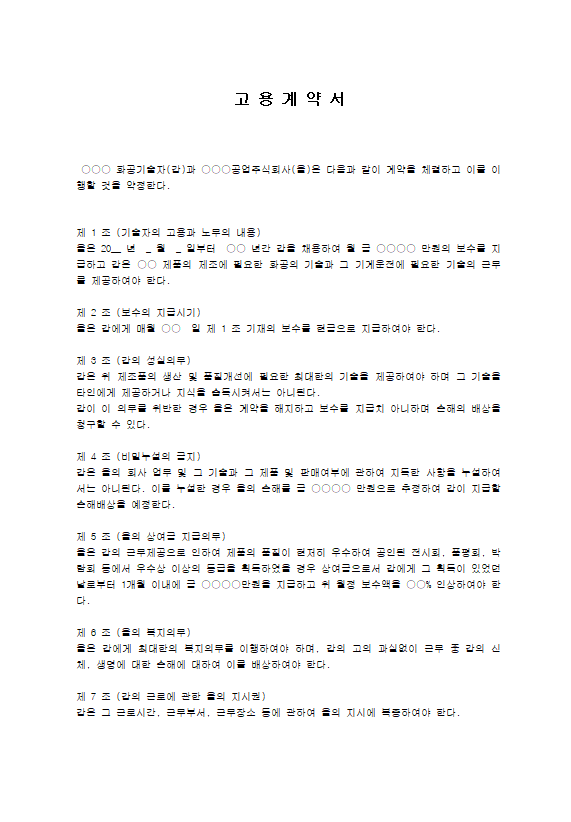 기술자 고용 계약서 양식 무료 다운로드