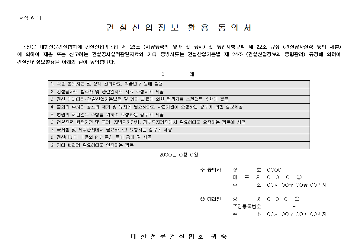 건설산업 정보 활용 동의서 작성 양식 무료 다운로드